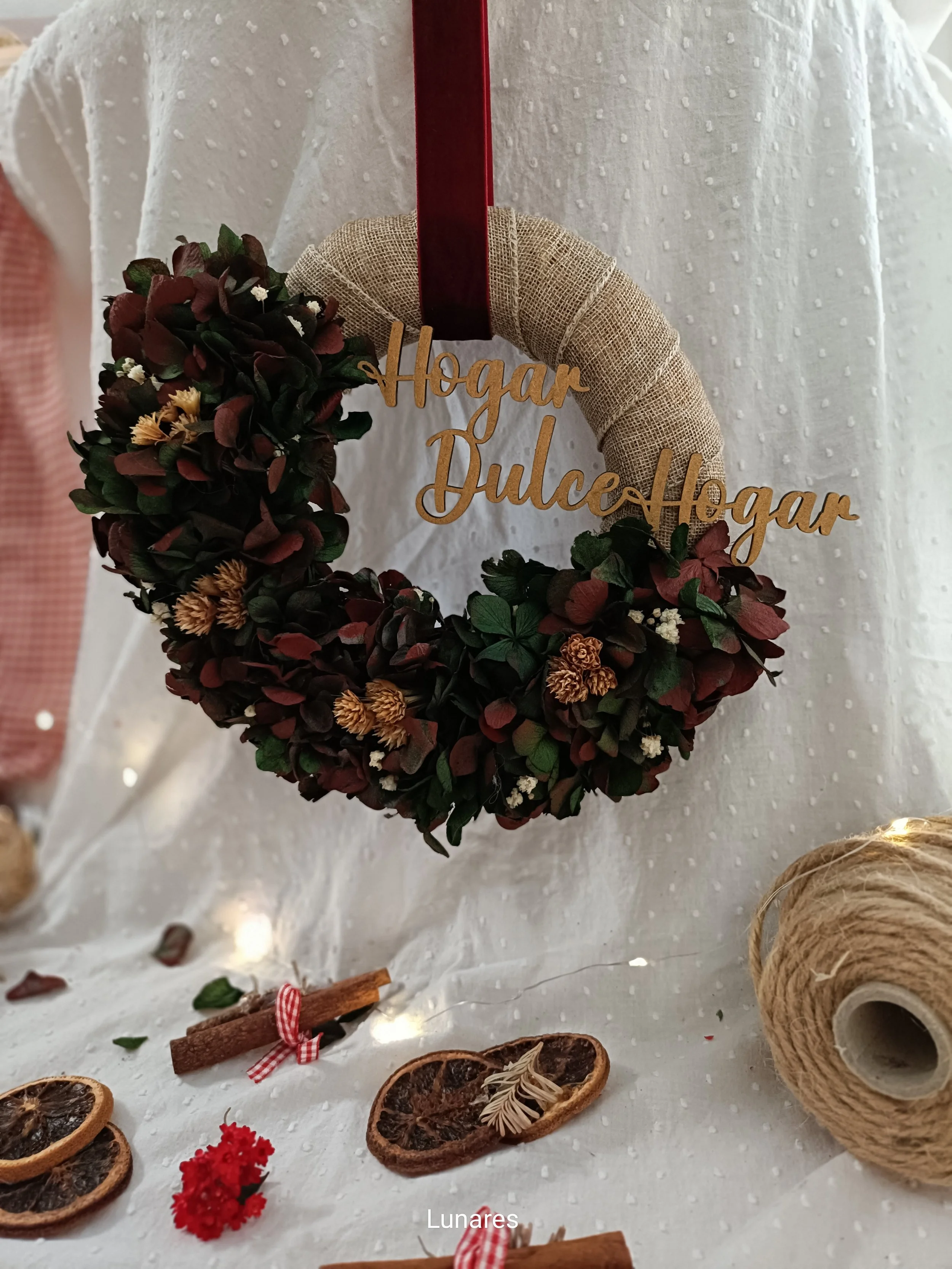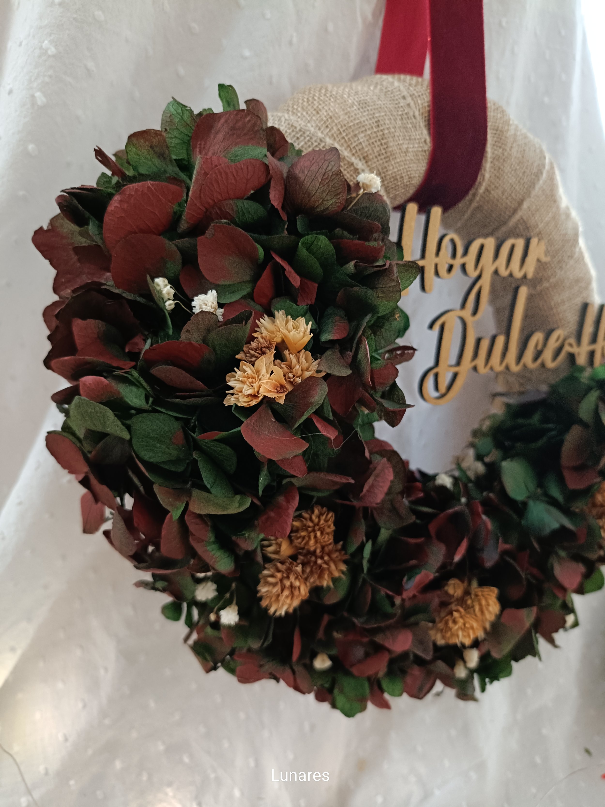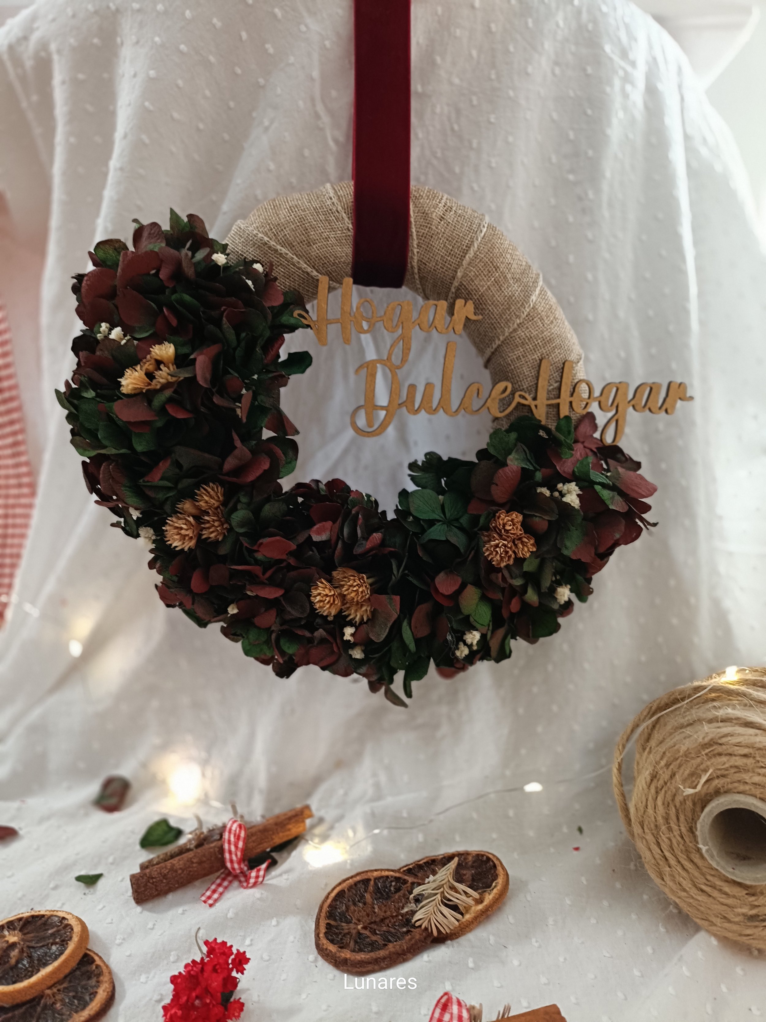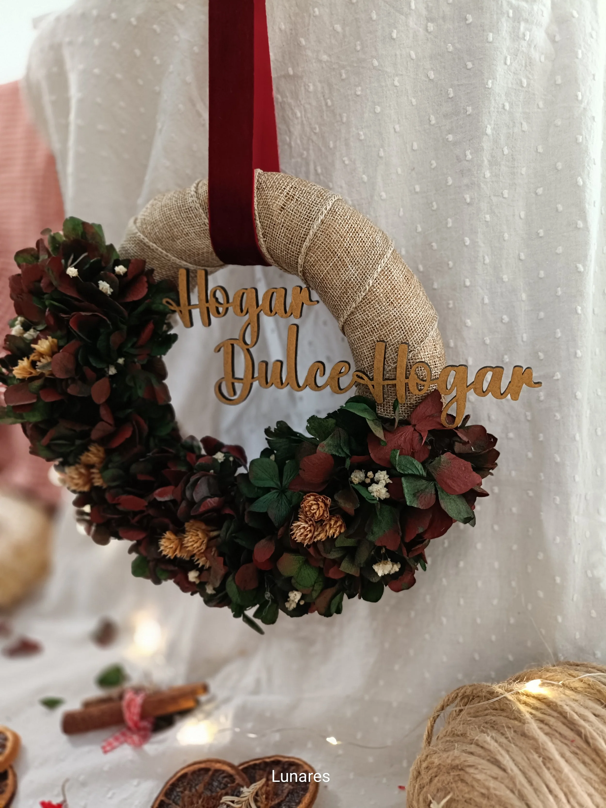 BaSe de 20x4cm forrada con cita de yute y hortensias preservadas, chispas de paniculata e Hill flower. Letrero de hogar dulce hogar aumenta tamaño a 25 cm total